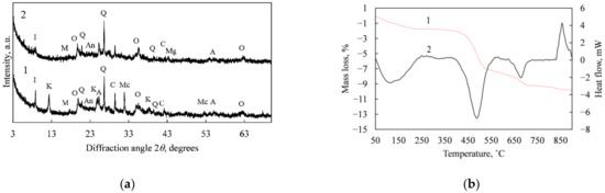 (a) X-ray diffraction patterns of expanded clay kiln dust as received (1) and reactivated (2), Indexes: M, muscovite KAl2(AlSi3O10)(F,OH)2; Q, quartz (SiO2); An, anorthite (Ca(Al2Si2O8)); C, calcite (CaCO3); K, kaolinite (Al2Si2O5(OH)4); I, illite (K0.65Al2.0[Al0.65Si3.35O10](OH)2); Mc, magnesite (MgCO3); O, olivine (MgFeSiO4); A, anatase (TiO2); Mg, magnesium oxide (MgO). (b) Simultaneous thermal analysis (1—TG, 2—DSC) results of ECD.