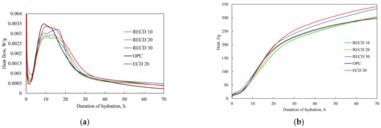 More heat of hydration (304–343 J/g) was determined (Figure 4b) in all samples with SCMs than in the sample of blank Portland cement (298 J/g) up to 70 h of hydration.