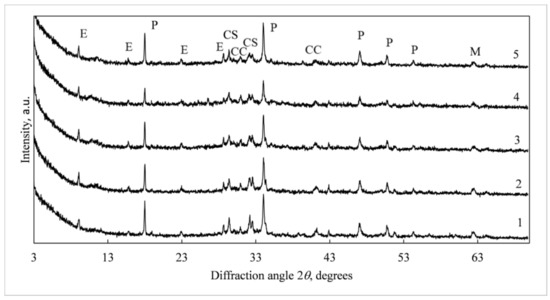 XRD analysis results of samples after 28 days of hydration. 1—OPC (0 wt.%), 2—OPC + 10 wt.% RECD, 3—OPC + 20 wt.% RECD, 4—OPC + 30 wt.% RECD, 5—OPC + 20 wt.% ECD. Indexes: E, ettringite (Ca6(Al(OH)6)2(SO4)3∙26H2O); P, portlandite (Ca(OH)2); CC, calcite (CaCO3); CS, calcium silicates (C3S, C2S); M, periclase (MgO).