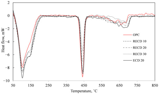 The outcome of simultaneous thermal analysis is presented in Figure 6, Figure 7 and Figure 8. Three endothermic peaks are visible in the DSC analysis graphs of all samples after 28 days of aging (Figure 6). The first peak at a temperature of 90–220 °C concerns the dehydration of many cement hydrates (CSH, ettringite, calcium aluminate hydrate and hydrogarnets), the second peak at a temperature of ~450 °C identifies the decomposition of portlandite, and, at a temperature of 650–750 °C, calcite (which was formed during carbonization of the samples) decomposes [24,29]. The curves of all samples are fairly similar, but a difference is visible in the peak profile between 90 °C and 220 °C. The shoulder at 145 °C is attributed to the dehydration of calcium aluminate hydrates, calcium aluminum silicate hydrates or carboaluminates [29], and it is visible only in the DSC graphs of samples with SCMs. Moreover, in the blank cement sample, the offset point of this peak is reached at a temperature lower than 200 °C, while, in all the samples with additives, the offset point is fixed at a temperature of 220 °C. The shift of the peak towards higher temperatures is also related to the dehydration of the compounds containing the aluminum component because the dehydration of these compounds occurs at ~180–280 °C, i.e., at a higher temperature than CSH dehydration (110–120 °C) [30,31]. Thus, the DSC analysis results confirm the presence of aluminate-containing phases in the samples with ECD and RECD additives.