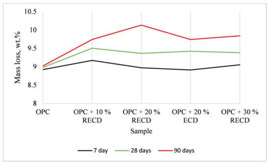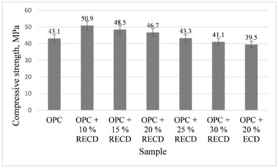 The compressive strength outcome (Figure 9) shows that, after 4 weeks of hydration, only the samples with 30 wt.% RECD and 20 wt.% ECD additive are distinguished, with a lower compressive strength compared to the cement sample. The specimens with 10 and 15 wt.% RECD additives (50.9 and 48.5 MPa, respectively) reached the highest compressive strength, whereas the compressive strength values of samples with 20–25 wt.% of RECD additive (46.7 and 43.3 MPa, respectively) are also higher than the blank cement sample. The samples with 30 wt.% of RECD (41.1 MPa) and 20 wt.% ECD (39.5 MPa) do not pertain to the same strength class (42.5) of cement.