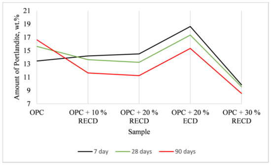 After 7 days of hydration, the mass loss of all samples with additives (except for the sample with 30 wt.% RECD) within the temperature range of 90–220 °C is higher than that of the blank cement specimen (Figure 7). As the duration of hardening increases to 28 and 90 days, this difference becomes even more pronounced. The highest mass losses are observed in the sample with 10 wt.% of RECD. These data show that, in all the samples with additives, more main cement hydrates (CSH, ettringite, calcium aluminate hydrate and hydrogarnets) are formed, which determines the strength of hardened cement. On the other hand, a highly unusual trend can be seen in the curves of the amount of portlandite formed during hydration (Figure 8). After 7 days of hardening, samples with both (RECD and ECD) additives, except for the sample with 30 wt.% RECD—where significantly less cement reacts—showed a higher amount of portlandite than the cement sample. The highest amount of portlandite was found in the sample with nonactivated dust. As pozzolanic activity results have shown that RECD is denoted by high activity, while ECD demonstrates medium-level activity, the higher amount of the formed portlandite can be clarified by the fact that the tested additives have a double effect on cement hydration. The amorphous part of these additives can participate in the pozzolanic reaction, while the crystalline compounds act as crystallization centers and accelerate the hydration process of calcium silicates, during which significantly more portlandite is formed. The less active additive (ECD) reacts more slowly with portlandite; therefore, these samples show a higher amount of portlandite than RECD samples. The progress of the pozzolanic reaction is confirmed by changes in the amount of portlandite as the duration of hardening increases from 7 to 28 and to 90 days. In the blank Portland cement samples, the content of portlandite increases, while, in all the samples with additives, a consistent decrease in the amount of portlandite can be seen with the increasing time of hydration. It should be noted that, even after 28 days of hardening, a higher amount of portlandite is identified in the sample with the ECD additive than in the pure cement sample. Summarizing the results of this part of the research, it can be stated that both nonactivated and activated expanded clay production waste has a double effect on cement hydration—that is, the pozzolanic reaction and the accelerated hydration of calcium silicates occur simultaneously.