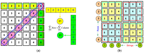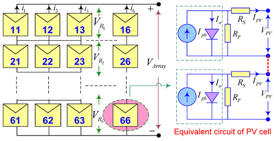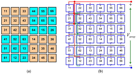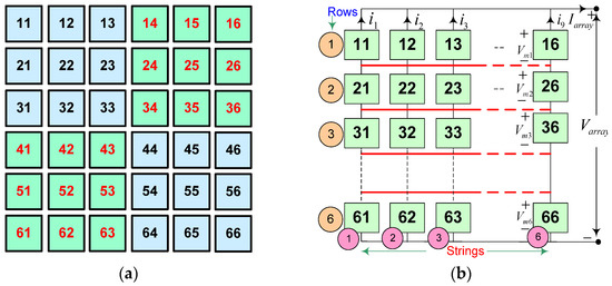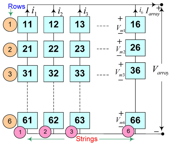 where and are the number of rows and columns in the considered 6 × 6 size PV array. Figure 3 depicts the TCT array’s electrical configuration of PV modules.
