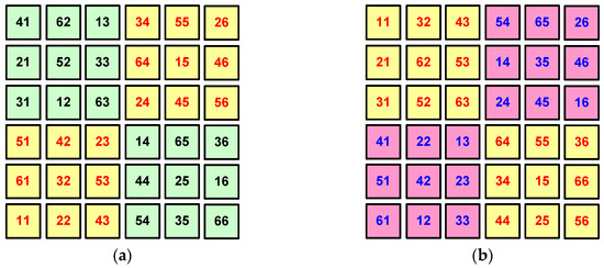 Cyclic arrangement of integer numbers from 1 to 6 is carried out to establish the SM game-theory-based arrangement. The summation of the considered integer numbers in each row and column is found to be equal as per SM development guidelines. In addition to that, either of the diagonal elements keeps repeating within it. Figure 5a depicts all of the assets of the 6 × 6 size SM as