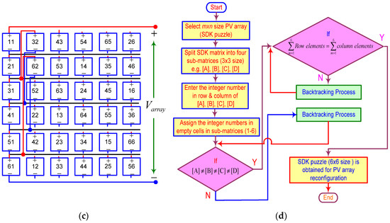 The SDK change in columns 2–6 is known as the I-SDK puzzle. By repositioning the PV modules without disturbing the electrical arrangement, the suggested I-SDK layout is implemented in the TCT PV array. In this game puzzle, higher dispersion is found based on the optimal placement of all the integer numbers in an array. This integer placement modification is responsible for higher shade dispersion. The SDK and I-SDK puzzles and approach are depicted in Figure 4a–d as