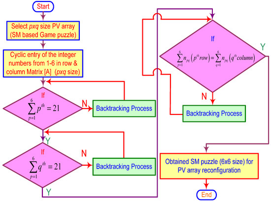 To represent the row-column summation rules, mathematical assumptions are made. In this context, the SM size is considered in the order of p × q. Moreover, the nth element can be placed corresponding to the pth and qth row-column, respectively. So, the location of the PV module (npq) in an array can be written in a generalized way and expressed in Equation (4) as