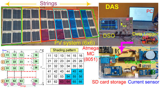 For performance validation, an experimental setup is established with 6 × 6 size PV array configurations with the assistance of an embedded-based data acquisition system (DAS) for logging real-time electrical parameters. The performance characterization in terms of I-V and P-V curves is performed for extensive performance analysis in different realistic shading scenarios. The above experimental setup comprises mainly four sections such as (a) PV system (6 × 6 size), arranged in SP, SDK and I-SDK configurations; (b) variable resistive load (Rheostat: 800 Ω, 6 A); (c) self-developed DAS. The developed experimental setup is shown in Figure 8.