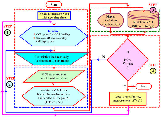 Using the AT-mega microcontroller (8051), a self-designed data logger is utilized, which includes analog voltage and current sensors for electrical data investigation. Realistic electrical performance parameters in terms of voltage and current are stored in a micro-SD card. These recorded data are used for I-V and P-V characterization and rigorous investigation of performance parameters. Figure 9 also depicts the working of the constructed data logger. The code has processes for measuring electrical characteristics that have been fine-tuned based on an assessment and data gathering that use a simple algorithm.