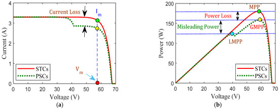 During the PSCs, multiple power points, i.e., GMPP and LMPP, were observed on the P-V curve. The higher power value is known as “power at GMPP ”. Furthermore, at which value of voltage, the higher power at GMPP is also called the “voltage at GMPP ”.