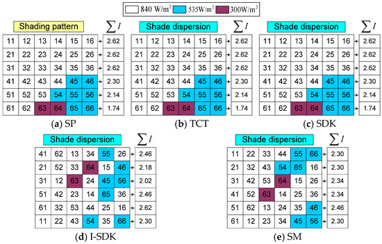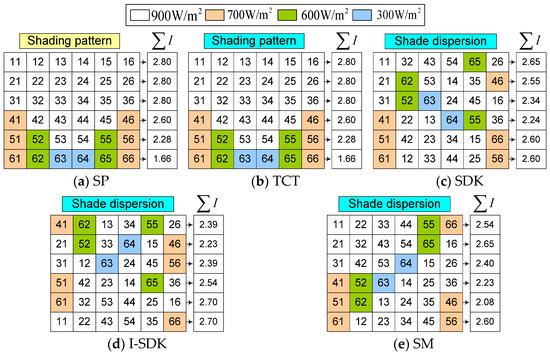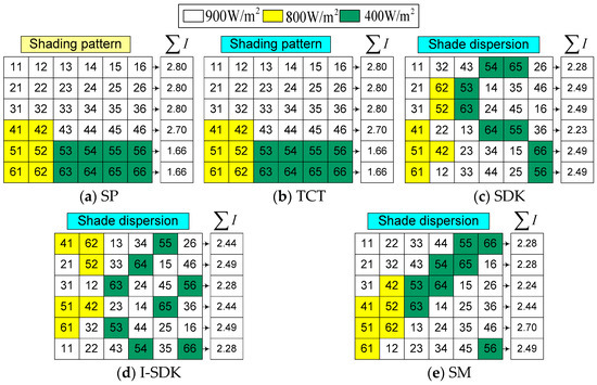 Based on the different methodologies and placement of integer numbers, these are responsible for developing the game puzzle with shade dispersion capability as shown in Figure 11a–e. With the consideration of nonuniform shade profiles from a minimum to maximum irradiance range such as 200 W/m2, 400 W/m2, 600 W/m2, 800 W/m2 and 1000 W/m2, an inclusive study was carried out with conventional (SP, TCT) and game theory (SDK, I-SDK and SM) based configurations. The considered shading pattern showed a highly nonuniform nature in irradiance. Furthermore, the game-theory-based reconfigurable methodologies are beneficial in terms of performance improvement due to the higher shade dispersion factor.