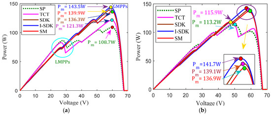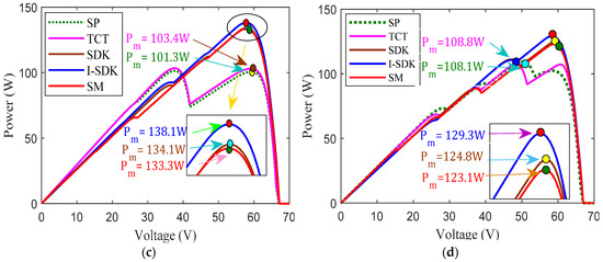 GMPP’s power evaluation results are given in Figure 17. The I-SDK arrangement delivered the greatest power at GMPP of 143.5 W, 141.7 W, 128.3 W and 129.3 W.