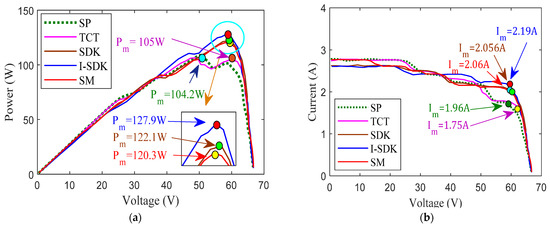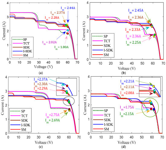 (a,b) I–V curves for SP, TCT, SDK, I-SDK and SM models under shading scenarios-IV.