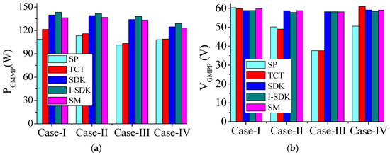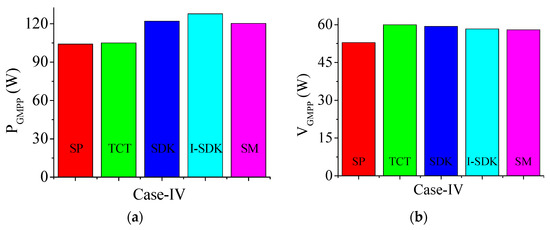Under shading case-IV, the SP, TCT, SDK, I-SDK and SM setups had different voltages at GMPP (52.90 V, 59.97 V, 59.36 V, 58.34 V and 58 V). Figure 22 is a bar chart depicting the power and voltage at GMPP.