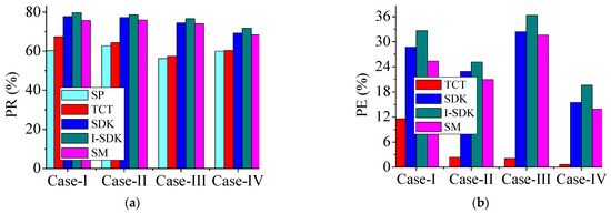 The PR and PE analysis was performed using MATLAB/Simulink, as illustrated in Figure 19. When compared to SP, TCT, SDK and SM arrangements, I-SDK had the highest PR of 79.63%, 78.63%, 76.63% and 71.75% in shading patterns I-IV.