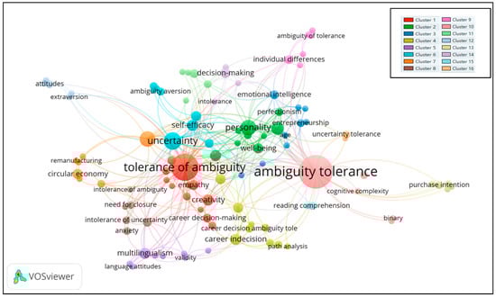 Keyword co-occurrence analysis was utilized to visualize the link strength between keywords in large data. Keyword co-occurrence analysis was the theoretical basis, and it can be combined with the co-occurrence of keywords function on VOSviewer. By analyzing the heated topics connected with ambiguity tolerance, we can grasp the research frontiers related to the topic. We set the minimum number of occurrences of a keyword as two. The outcome is that 102 items meet the threshold. There are 16 clusters, 318 links, and a total link strength of 423 on the visualization of the co-occurrence of author keywords (Figure 2). The top 20 keywords are ambiguity tolerance, tolerance of ambiguity, uncertainty, ambiguity, personality, medical students, career indecision, creativity, medical education, multilingualism, self-efficacy, career decision, circular economy, decision making, empathy, tolerance, well-being, emotional intelligence, factor analysis, and knowledge sharing. These words are widely discussed and closely connected with AT. Keyword co-occurrence analysis provides references for the interrelations between AT and its correlates.