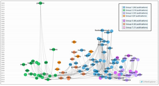 Since AT is an emerging research topic in the COVID-19 pandemic and post-pandemic era, the total number of documents on AT is relatively small. The citation network in Figure 3 created by CitNetExplorer not only displays the impact power of the earliest author but also shows the direct and indirect citation links among the authors in a detailed topic group. The current network includes 719 publications and 2959 citation links. The time span ranges from 1909 to 2023. All of the publications are represented by the author’s family name. These articles are concerned with “ambiguity tolerance” (topic).