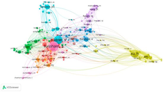 We also obtained the top 10 co-cited authors through co-citation analysis. The minimum number of citations of an author was set as 6. Of the 9517 cited authors, 253 met the threshold. As is shown in Figure 4, the top 10 co-cited authors were Furnham (citations = 163, total link strength = 2885), Budner (citations = 127, total link strength = 2145), Xu (citations = 118, total link strength = 2890), Mclain (citations = 113, total link strength = 2042), Bandura (citations = 54, total link strength = 925), Dewaele (citations = 52, total link strength = 670), Frenkelbrunswik (citations = 48, total link strength = 982), Geller (citations = 44, total link strength = 833), Norton (citations = 42, total link strength = 582), and Gati (citations = 40, total link strength = 1117). These authors are the most influential ones since they are co-cited by the most documents. Their articles provide referential meaning for other authors to conduct similar studies. The size of the dots represents the number of publications and a thicker line means a stronger link. A co-citation network refers to two dots cited by the same document. A bibliographic coupling network refers to two dots citing the same document [31]. The numeric data show that Budner [11] and Furnham [35] are the top two cited documents, while the two authors are the top two cited authors. The third most co-cited author Xu is a prolific author with 12 documents on ambiguity tolerance (topic).