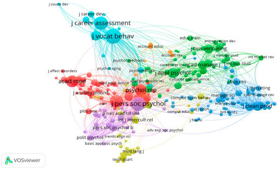 We also analyzed co-cited sources by selecting co-citation as the analysis type, and source as the unit of analysis. The minimum number of citations of a source was set as 10. Of the 5271 cited sources, 252 met the threshold. As is present in Figure 5, the top 10 co-cited sources were Journal of Vocational Behavior (citations = 279, total link strength = 9526), Journal of Personality and Social Psychology (citations = 239, total link strength = 11,349), Journal of Career Assessment (citations = 219, total link strength = 7591), Journal of Personality (citations = 208, total link strength = 7242), Personality and Individual Differences (citations = 196, total link strength = 7611), Academic Medicine (citations = 174, total link strength = 3534), Psychological Reports (citations = 155, total link strength = 5443), Journal of Applied Psychology (citations = 128, total link strength = 5382), Journal of Counseling Psychology (citations = 117, total link strength = 4705), and Journal of Cleaner Production (citations = 115, total link strength = 5510). The co-citation of cited sources on VOSviewer is different from the cited sources on WOS. From the co-citation source, we found that ambiguity tolerance was widely studied as a psychological factor.