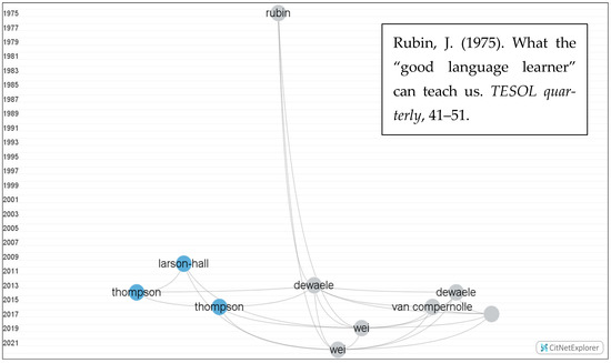 We drilled down Group 5, with 66 publications in the language learning context as is shown in Figure 8. We found the first longest path in Group 5 led by the earliest author Rubin [43], with all the publications discussing the influence of multilingualism on ambiguity tolerance. Rubin [43] regarded the capability to feel at ease toward uncertainty and vagueness as a good language-learning strategy. We mainly focused on the earliest document of Rubin [43], the most cited document [4] of Dewaele [5] with 89 citations, and the latest document of Wei [13]. The interconnections, including cooperation and citation between the earliest and the latest authors, can be seen from the citation network. Visualization of the citation network shows the impact power of the earliest author. All of the publications are under the influence of Rubin [43] and cite the viewpoints of the earliest author. In addition, the citation network displays the relatedness and interconnection between the authors as well. It is evident that multilingual and multicultural environments could exert a positive effect on ambiguity tolerance. AT is one of the essential properties of cross-cultural communication. Ambiguity-tolerant learners are competent in solving problems caused by cultural differences [44].