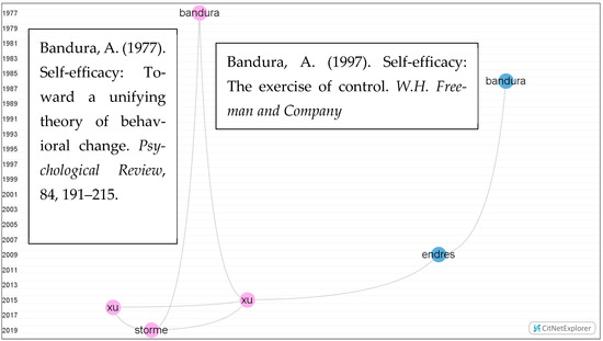 To answer this research question, the researchers drilled down the multiple longest paths of six publications in the Group 5 language learning context, with the initial ones led by Bandura [17] and Bandura [18], respectively (See in Figure 9). The newest one is Storme [45]. The most cited document is Xu [46] with 56 citations. Self-efficacy is the theme of this longest path. Self-efficacy is a crucial mediator in deciding personal choices, objectives, and accomplishments [17]. Proficient learners tend to possess better self-efficacy, which refers to a sense of achievement in the learning process [18]. Self-efficacy can be interpreted as an essential indicator of successful experiences and fulfillment in the learning process [47]. Generally speaking, successful experiences strengthen the sense of achievement, confidence, motivation, and internal drive, which lead to higher self-efficacy [48]. Ambiguity-tolerant individuals excel at self-efficacy management [49].