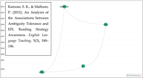 This longest path, led by Kamran [51], discusses AT’s role in influencing engagement in the Group 5 language learning context (see Figure 10). This longest path shows the peculiar citation network between Kamran [51] and Yang [34]. Yu et al. [6] proved the essential role of AT and perseverance in facilitating learners’ engagement in language learning contexts. The most recent publication by Yang [34] demonstrated that AT influences college teachers’ stress, cognitive overload, burnout, emotional intelligence, enthusiasm, and teaching engagement. Engagement refers to individuals’ time, effort, and energy put into sustainable language learning. Academic engagement could be subdivided into teachers’ work engagement and students’ learning engagement. According to Yu et al. [6], in the COVID-19 post-pandemic era, curriculum designers, academics, and instructors strive to enhance learning engagement to maintain online education. The foundational effects of ambiguity tolerance and perseverance on learners’ engagement are also proven [6].