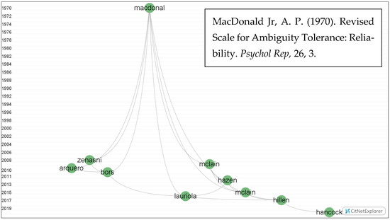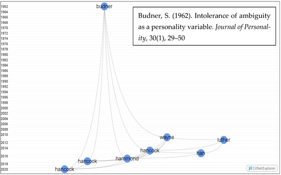 We obtained the top 10 co-cited references through co-citation analysis. The minimum number of citations of a cited reference was set as 3. Of the 12,266 cited references, 487 met the threshold. The top 10 co-cited references were Budner [11] (citations = 125, total link strength = 1602), Furnham [35] (citations = 62, total link strength = 940), Furnham [36] (citations = 51, total link strength = 695), Mclain [37] (citations = 48, total link strength = 686), Frenkelbrunswik [10] (citations = 42, total link strength = 665), Norton [38] (citations = 42, total link strength = 582), MacDonald [39] (citations = 39, total link strength = 493), Herman [40] (citations = 33, total link strength = 459), and Hu [41] (citations = 26, total link strength = 484). These references are among the most influential ones since they are co-cited by many documents.