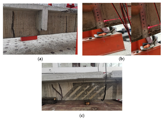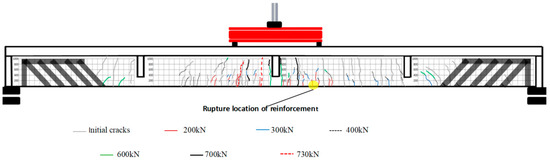 From the initial loading to 200 kN, old dense micro-cracks appeared at the bottom edge of the web. When the load reached 300 kN, many micro-cracks extended upward, and the width of the web bottom simultaneously widened. The cracks extended to a height of 500 mm from the bottom of the web. At 400 kN, new cracks appeared at both ends of the specimen. Most of the new cracks were near the two sides of the mid-span partition in the bending section, and some of them extended upward along the old cracks. At 500–600 kN, the number of cracks in the specimen increased significantly; new cracks mainly occurred on the web surface at both ends of the specimen, while the cracks on the web surface close to the loading distribution beam widened rather than extending. The bonded GFRP rattled constantly in this load range, and part of the longitudinal reinforcement bars began to yield. After 600 kN, the deformation of the specimen increased sharply, with visible deformation on the web surface, and there was brittle fracture noise from the GFRP. After 700 kN, the obvious cracks on both sides of the mid-span diaphragm continued to extend upward, through the height of the web (Figure 8 and Figure 9).