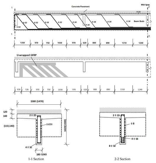 The bridge was built according to the atlas published by the Ministry of Communications of the People’s Republic of China in 1973. According to the design document, the body of the T-beam was made of 250# concrete (fck ≈ 23 MPa), and grade II steel bars were adopted as mainly longitudinal bars. The longitudinal bars of the mid-span section of the T-beam were arranged as vertical strings. The ends of the longitudinal bars were bent at a 45° angle, as shearing reinforcement according to the moment envelope diagram. The pavement, also made of 250# concrete and with a 120 mm designed thickness, was laid at the top surface of the T-beam. In 2005, to enhance the bearing capacity of the bridge, the 20 m T-beam span was retrofitted by recasting the pavement on the top surface with C40 concrete, and a single layer inclined U-wrapped GFRP strips was bonded on the web surface with 300 mm spacing and a single layer on the bottom surface. The designed tension strength of the GFRP was greater than 500 MPa, and the average thickness and width were 1 mm and 300 mm, respectively. The main data of the specimen are shown in Figure 3. However, there were local discrepancies between the actual and standard size of the specimen, influenced by the initial defect of the specimen and cutting errors. In Figure 3, the dimensions given outside the brackets indicate the standard size of the specimen, and the numbers in the brackets indicate the actual size.