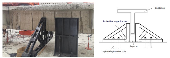 After the specimen was lifted, laser equipment was used for accurate alignment. For super-large span specimens, out-of-plane instability due to eccentric positioning or initial component defects must be considered. To ensure safety during the experiment, a pair of protective angle frames was placed on both sides of the 1/4 and 3/4 span partitions of the specimen and anchored to the ground with high-strength anchor bolts (Figure 5). There was 50 mm of space between the specimen and the protective angle frame.