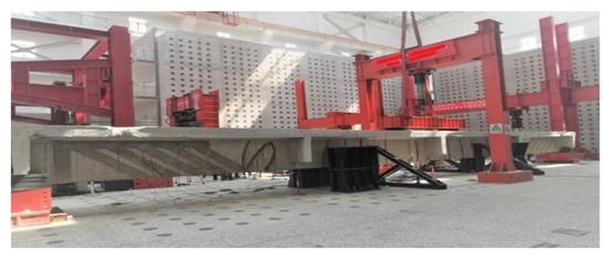 The test device is shown in Figure 6. The loading reaction frame, placed perpendicular to the length direction of the specimen, was in the same plane as the mid-span section of the specimen. A 2000 kN vertical hydraulic jack was fixed at the center of the counter beam; the bottom of the jack was connected to the 100 T load sensor; and the end of the sensor was connected to the loading plate pair and placed on the rigid distribution steel beam.