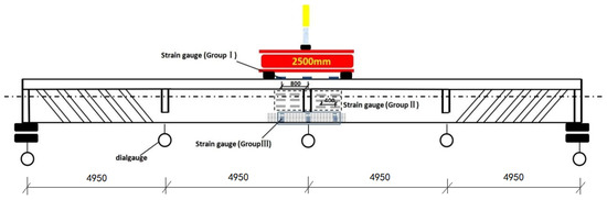 As shown in Figure 7, the strain gauges on the flexural specimen can be divided into three groups. In group I, three concrete strain gauges were arranged in each row of the pavement along the length direction of the specimen. The center point of the strain gauge in the middle corresponded to the mid-span section of the specimen, and the center distance of the strain gauge was 800 mm. Group II strain gauges were arranged on the surface of the two sides of the web in the mid-span area of the specimen. Four rows of strain gauges were arranged on each side, and two rows of strain gauges were arranged on each side of the middle line of the mid-span partition with a spacing of 400 mm. Each row contained three rows of strain gauges with a spacing of 150 mm. Group III comprised 1 × 2 mm reinforcement strain gauges with standard spacing. Three rows of reinforcement strain gauges were arranged on each web side, spanning 800 mm. The center of the middle row was within the mid-span section of the specimen. Five dial indicators were set up at both ends of the bending specimen bearing, quartile points, and the middle of the span.