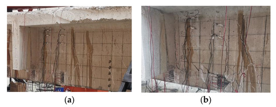 Compared to the newly cast-in-place specimens described in the literature, the original T-beam has many unique features. Firstly, five concrete ribs were designed at both sides of the web of the original T-beam (Figure 2a), and this measure was used to ensure the stability of the T-beam during loading. Additionally, it was obvious that widespread stains, local defects, and macro-cracks were distributed on the surface of the specimen. Meanwhile, a 28 mm initial deflection resulting from a creep at the middle span section was discovered, as shown in Figure 2b. These seem inevitable for a concrete specimen exposed to the natural environment for more than 30 years. However, as shown in Figure 2c, after 17 years of service, the GFRP strips were intact, and no debonding or cracking occurred.