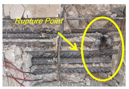 The ultimate state of the specimen showed that the failure was characterized by the rupture of longitudinal reinforcement. The position of the rupture point was 900 mm from the mid-span section. The longitudinal steel bars had a vertical layout, with 432 + 216 upright bars. Figure 11 shows the loss of bearing capacity resulting from the snap of the 32 mm diameter steel bars in the third line, and the adjacent steel bars (upper 16 and lower 32) all showed the phenomenon of pinching at the neck. The stress of the reinforcement group was rapidly redistributed after the tensile fracture of the lower 32 steel bars, and the adjacent steel bars immediately pulled off.