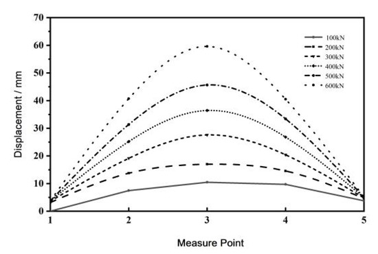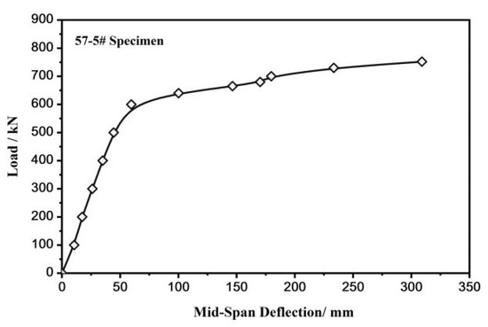 The load-deflection curve of the mid-span section of the specimen is shown in Figure 12. The # is the number of specimen. The ultimate load of the specimen was 752 kN, the maximum mid-span deflection was 309.2 mm, and the ultimate bending capacity of the specimen was 3684 kN m. The mid-span deflection increased with increasing load, and the slope of the deflection changed significantly at 600 kN. Before 600 kN, the deflection of the mid-span varied linearly with the load, but after 600 kN, the deflection increased rapidly, indicating that the main reinforcement began to yield. The displacement of the mid-span point, span end, and quadrangle point was measured under the action of loads at all levels (Figure 13). As shown in Figure 13, before the yield load, the displacement distribution in the quadrants was basically symmetric. When the load was 100 kN, the ratio of the average quad-point and mid-span displacement was 82%. Notably, the displacement of measured points at 100 kN was not strictly symmetric: the displacement of point 4 was marginally larger than that of point 2, which could be attributed to the in-homogeneity of initial loading. When the load reached 600 kN, the average displacement of the quad-point was only 68% of the mid-span displacement. Therefore, the ratio of the quad-point displacement to the mid-span displacement gradually decreased with increasing load.