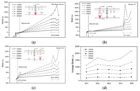 Additionally, the strain of abreast steel bars was not linearly distributed. Under the action of loads at all levels in the three test sections, from top to bottom, the strain at the bottom of the second and fifth rows was greater than that of other rows. The curves of sections 2-1 and 2-3 are expected to be the same because of symmetry, but the actual strain distribution did not strictly fit the pattern. This phenomenon could be attributed mainly to the heterogeneity of concrete and steel bars resulting from long-term service or the low construction quality at that time. As shown in Figure 14a–c, the strain distribution of steel bars was also asymmetrical. However, it must be noted that the strain distribution of steel bars of each section (section 2-1 or 2-3 or mid-span section) had a similar pattern. The strain of the second steel bar was always obviously larger than the other steel bars. The average tensile strain of each steel bar at every loading stage is shown in Figure 14d, where S2i means the average strain of the steel bar of the ith line. It is obvious that the distribution of average strain of steel bars also fit the pattern mentioned above. It is concluded that the strain distribution of the section has larger differences from the ideal condition of the plane section assumption, especially for an old large-span T-beam with longitudinal steel bars arranged vertically. It is obvious that the second steel bar had larger strain, which is consistent with the rupture point shown in Figure 11. It follows that the quality of the steel bars was not uniform, and the abnormal performance of individual steel bars could influence the sectional strain distribution and even the performance of the whole specimen.