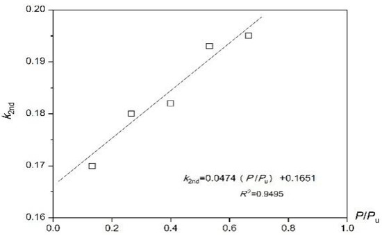 In Equation (1), K2nd is the strain increment index of the 2nd line steel bar, P and Pu is the vertical load and the estimated bearing capacity of the specimen, respectively. Pu, related to the ultimate moment Mu, which can be determined by the method of the Chinese design code of concrete structures GB50010-2010 [27] as follow: