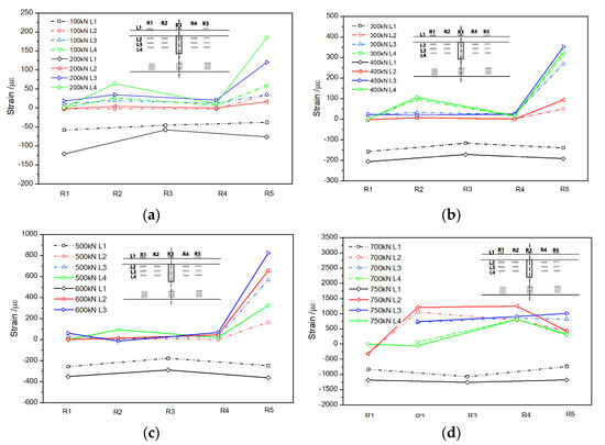 Strain distribution of concrete: (a) 100–200 kN, (b) 300–400 kN, (c) 500–600 kN, (d) 700–750 kN.