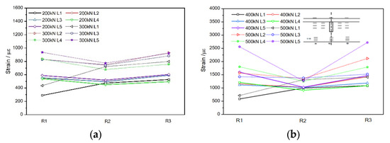 The strain distribution of the concrete web in each row is shown in Figure 16a–d. The middle strain in row 1 (strain gauges at the top of the flange) was smaller than the strain of both sides, but the difference decreased with increasing load. Comparing Figure 16 and Figure 17, we can see that when the beam surface was bending, the mid-span section deformed less than the other sections. In addition, the concrete strain was significantly greater in R5 than in other columns under various loads, which is also related to the detection of steel bars in this section. Figure 17a,b shows the strain of steel bars under different load grades. The regular is similar to the rule above. For the three test sections in the same section, the strain of the mid-span section is smaller than that of the cross-sections on both sides, and the reinforcement strain is symmetrical on both sides based on the mid-span section. Further, the mid-span section has strong carrying capacity.