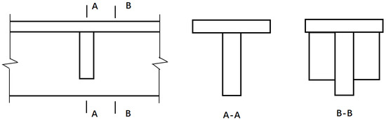 Whether in concrete or steel bars, the strain and deformation of the mid-span section are smaller than those of adjacent sections on both sides, which must be attributed to the stiffening function of concrete ribs in the mid-span section. As shown in Figure 18, A-A and B-B are the sections with and without ribs. A big difference between the cross-sectional moment of inertia and cross-section resistance moment of the two sections can be observed. Thus, the normal stress and strain on the two sections was also different. According to the mechanics of the materials, the difference of stress in the two sections depends on the bending moment and the size of the rib. Notably, if the stiffening ribs are arranged on the section with the largest bending moments, the adjacent sections suffering approximate bending moments are also in danger, and the sectional strength also should be checked, especially with large spans and old T-beams.