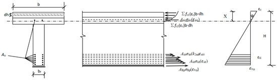 The section was characterized by an upper concrete pavement layer and lower steel bars arranged vertically. The strain distribution of the section is shown in Figure 19, where b and bf are the width of the flange and web; Asi, εsi, and σsi represent the area, strain, and stress of the longitudinal stress reinforcement in the mid-span section; Afrp, σfrp, and εfrp represent the cross-sectional area, stress, and strain of the FRP strengthened mid-span; fc1, fc2 and εc1, εc2 are the stress and strain of the concrete of T-beam and pavement; X and H are the height of compression zone and total height of the section; dh is the height of each strip; φ is the curvature of the section; and M is the bending moment of the section.