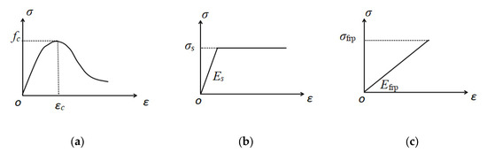 Constitutive relation of materials: (a) concrete, (b) steel bar, (c) FRP.