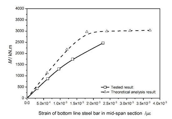 According to the above method, the M-φ curve of the ideal mid-span section of the specimen can be determined through iterative programming, as shown in Figure 21. It shows that the theoretical curve has a similar trend to the experimental results, even though the former has larger stiffness, which can be attributed to the loss of bonding stress between longitudinal steel bars and concrete or another related factor of concrete durability. However, it is seen that the theoretical bearing capacity is close to the experimental value, as shown in Table 4. It is worth noting that the last point in the tested curve is not the ultimate point. The deficiency of the tested curve can be explained by the broken strain gauge at the ultimate moment.