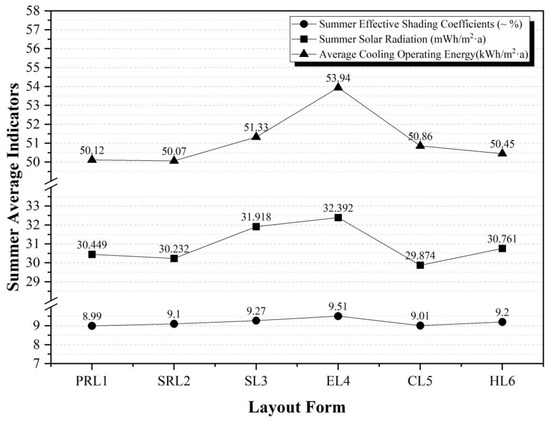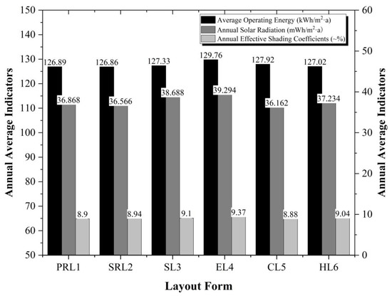 Based on the data presented in Figure 2, the average cooling energy consumption (ACEC) of the six types of layout exhibited a similar pattern of high and low distribution as the average operational energy consumption. The rankings for average cooling energy consumption, from highest to lowest, were as follows: EL4 > SL3 > CL5 > HL6 > PRL1 > SRL2. Additionally, the summer effective shading coefficients (SESCs) and summer solar radiation (SSR) also exhibited distinct rankings among the six layout forms. For the summer effective shading coefficients, the rankings for shading effectiveness, from highest to lowest, were as follows: PRL1 > CL5 > SRL2 > HL6 > SL3 > EL4. Similarly, the rankings for solar radiation received by the building complex during summer, from highest to lowest, were as follows: EL4 > SL3 > HL6 > PRL1 > SRL2 > CL5.