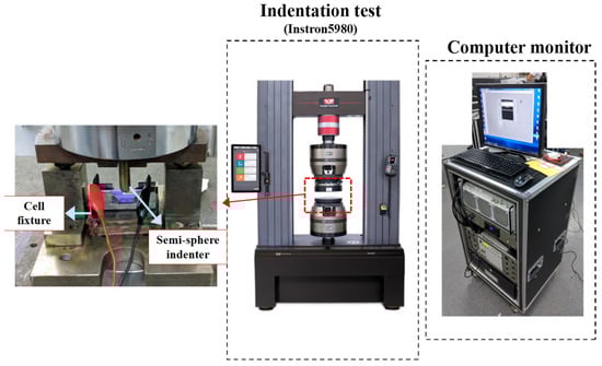 In this study, 18,650 commercial ternary/graphite lithium-ion battery cells (DMEGC, INR18650-26E, Donghua, China) were used. The operating voltage ranges from 2.75 V to 4.2 V. The nominal capacity of all cells is 2600 mAh. The internal resistance is less than 25 mΩ. The standard charge and discharge currents are 0.5 and 1 charge rates (C-rate), respectively. The indentation tests were conducted using an electron universal testing machine (Instron, 5980, Boston, MA, USA) as shown in Figure 1. The indenter is a semi-sphere with a diameter of 12.7 mm. To ensure safety during compression, the SOC of the tested cells was discharged to 0% before indentation. The voltages of the cells and force–displacement curve during compression were recorded to estimate ISC. The cell being tested experiences ISC when the indentation depth exceeds 7 mm, so the displacements of indentation were set at 5, 6, and 7 mm to obtain the fault features of mechanical deformation before the cell experiences ISC.