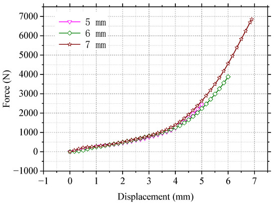 Three cells were indented at the center of the side face with depths of displacement of 5 mm, 6 mm, and 7 mm, as shown in Figure 3. The force−displacement curves during the indentation process are illustrated in the figure. The mechanical responses of the tested cells during indentation are relatively consistent, but the difference between cells enlarges with increasing depth of indentation. It can be observed that the force−displacement curves grow exponentially. As the indentation depth increases, the deformation of the battery initially starts from the battery casing and progresses to the deformation of electrode materials near the edges. Consequently, more electrode materials become involved in the mechanical deformation process, resulting in exponential stress increase with increasing displacement of indentation. The stress values reach 2239.5 N, 3876.9 N, and 6852.7 N at displacements of 5 mm, 6 mm, and 7 mm, respectively. These values are much lower than the results reported by Liu et al. [33] and Xing et al. [34]. This difference could be attributed to the variance in mechanical deformation between cylindrical cells and prismatic cells. The cylindrical cell allows for more space for deformation, making the force−displacement curve flatter compared to that of the prismatic cell.