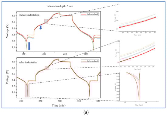 Changes in the internal properties of batteries, such as internal resistance, health, and capacity, can directly influence voltage performance. Figure 5a shows the variation in voltage consistency caused by mechanical deformation at a 5 mm depth of indentation. Prior to subjecting the cells to mechanical abuse, the voltage of all cells should be consistent. However, due to the specified cells used for the indentation test having a higher capacity than other cells, there is an intrinsic capacity inconsistency between the specified cell and the normal cells, resulting in its voltage being higher than the other five normal cells at the end of the discharging and resting periods. This is because the same energy was discharged from these cells in the same discharge time, and the specified cell with higher capacity would have higher SOC and show higher voltage than other cells. Despite this, it can be observed that the voltage of the indented cell declines to the lowest value during the charging period compared to the voltage data of the battery module before cell deformation. At the end of the discharge process, the voltage of the indented cell sharply decreases and deviates significantly from the other normal cells. The same phenomenon can also be observed in the cycle test of the battery module after loading the mechanical abuse at depths of indentation of 6 mm and 7 mm, as shown in Figure 5b,c. With an increase in indentation depth, the deviation becomes more pronounced. This is mainly due to the indentation causing a decrease in battery capacity. The decrease in capacity changes the characteristics of the battery from exhibiting a higher voltage at the end of discharge (typical for batteries with initially larger capacity) to exhibiting a lower voltage than the other cells. The reason is similar to the explanation for higher voltage of the specified cell at the end of the discharging period, that the indented cell with lower capacity has lower SOC and shows lower voltage than other cells after the discharge. According to our previous study [32], degraded capacity is positively correlated with the degree of mechanical deformation. Therefore, the variation of the indented cell with a 7 mm depth of displacement is greater than that of the indented cell with a 5 mm depth of displacement.