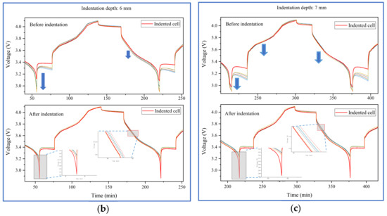Capacity change of indented cells before and after the mechanical loading at (a) 5 mm, (b) 6 mm, and (c) 7 mm depths of indentation.