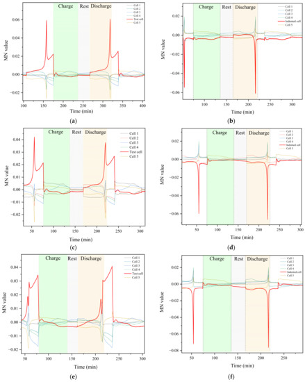 Though the indented cell exhibits voltage deviation at the end of the discharge period, this feature may be difficult to identify and use for early warning due to the minor variation feature being easily disturbed by other factors such as the inherent inconsistency of the battery module itself. To better extract characteristic signals, the above voltage curves are transformed into MN values using Equation (1). Figure 6 presents the enlarged MN value of the cells’ voltage in the charge−discharge cycle test of the battery module before and after indentation. These figures quantitatively describe the voltage deviation of each cell. Figure 6a shows that the MN values of the cells’ voltage are distributed around 0 with a range of 0.01 in the charging and resting periods before the indentation. However, the MN value of the specified cell gradually deviates from the other cells and increases to 0.06 in the discharging period. At the same time, the MN value of the other cells declines below 0 due to the deviation of the specified cell elevating the average voltage . Figure 6b shows that the MN value of the indented cell’s voltage remains below 0 and reaches a minimum in the charging period after indentation. At the end of discharge, the value sharply declines to −0.06. Meanwhile, the MN value of the other cells increases briefly. Accordingly, the voltage deviation of the indented cells shown in Figure 5a changes from higher to lower. The same feature of the MN value of the indented cells can also be observed in Figure 6c−f, where it is close to 0 at the beginning of charging and then declines to the lowest value at the end of discharging during the cycle test after indentation.