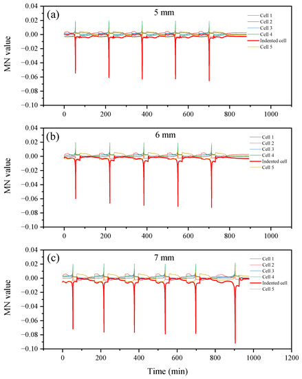 MN value of cells’ voltage during cycling after loading (a) 5 mm, (b) 6 mm, (c) 7 mm depth of indentation.