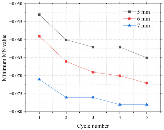 Figure 7 presents the MN value of the battery module during cycling after loading the mechanical abuse. Clearly, there is a sharp decline in the MN value of the indented cell and an increase in the MN value of other normal cells at the end of every discharging period. The minimum MN values of the indented cells under different mechanical loading conditions are compared in Figure 8. It can be observed that the minimum MN value decreases with an increase in indentation depth and cycle number, indicating that the voltage deviation of the indented cell gradually enlarges with an increase in cycle number and mechanical loading. The absolute values of these maximum MN values are beyond 0.04, which is much higher than that of normal cells. If the MN value is used for pre-warning, the indented cells can be easily detected by the sharp decline feature at the end of discharge using a threshold of −0.04.